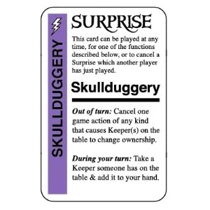 - The final card in the deck is the Surprise! Card. It is exactly as it is described. It is usually something that makes the game a little more challenging. It is usually the only card that can be played in and out of turn, and it has instructions for each method of use. Surprise cards usually make most players nervous and it generally involves losing precious cards!
