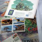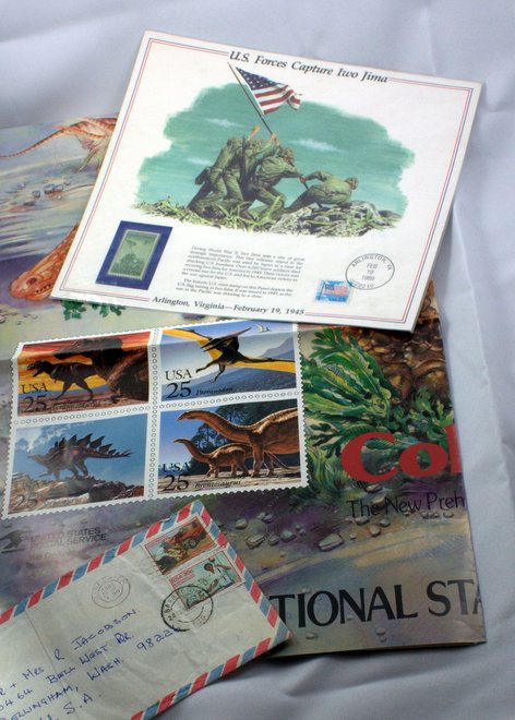 Bits and pieces of a stamp collection: a poster with dinosaur stamps, a commemorative Iwo Jima stamp, and an envelope with stamps from South Africa.