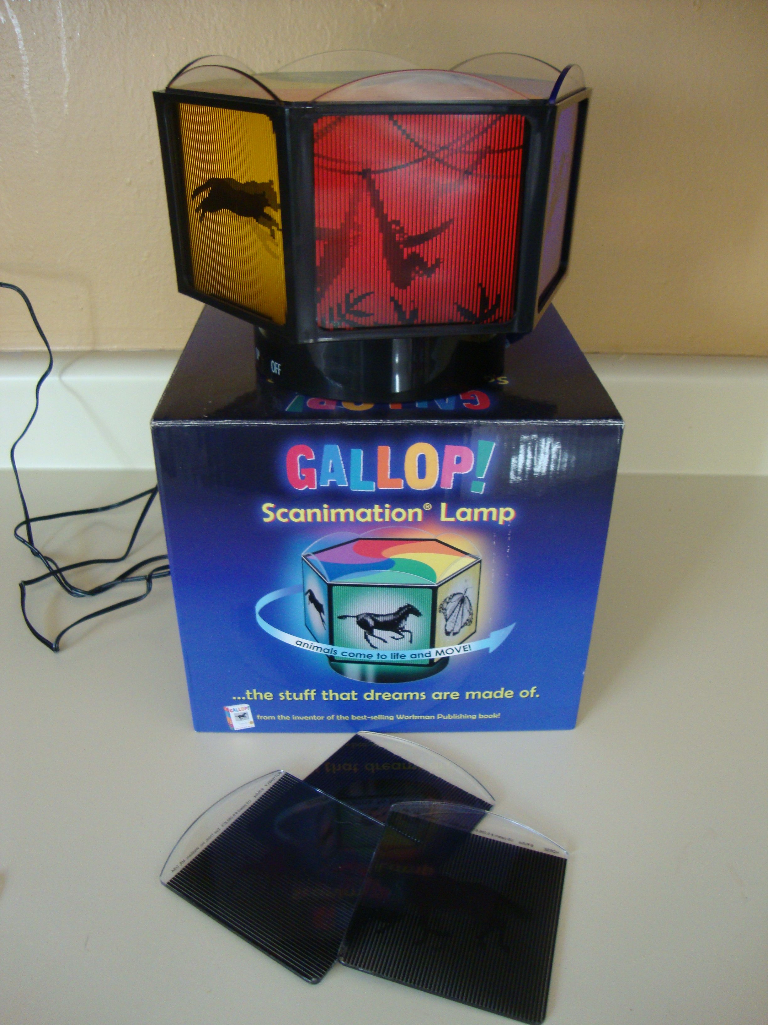He recently sent me a sample of his newest product, something called a Gallop! Scanimation Lamp. It uses the same optical illusion technique as the books and CineSpinners, but in the form of a lamp. As the lamp turns, the animals seem to run, jump, and swing.