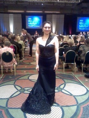 Author Barb Ferrer bid on and won this Proenza Schouler gown (originally worn by Maggie Gyllenhaal at the 2007 Oscars) at a Clothes Off Our Backs auction. She wore it the night her debut novel won a RITA award.