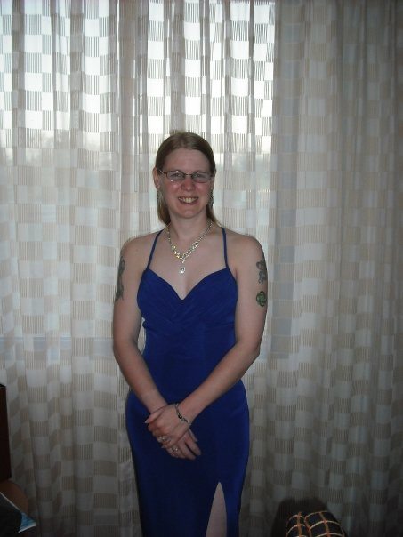 GeekMom Karen Burnham rocking a gown that shows off her tats.