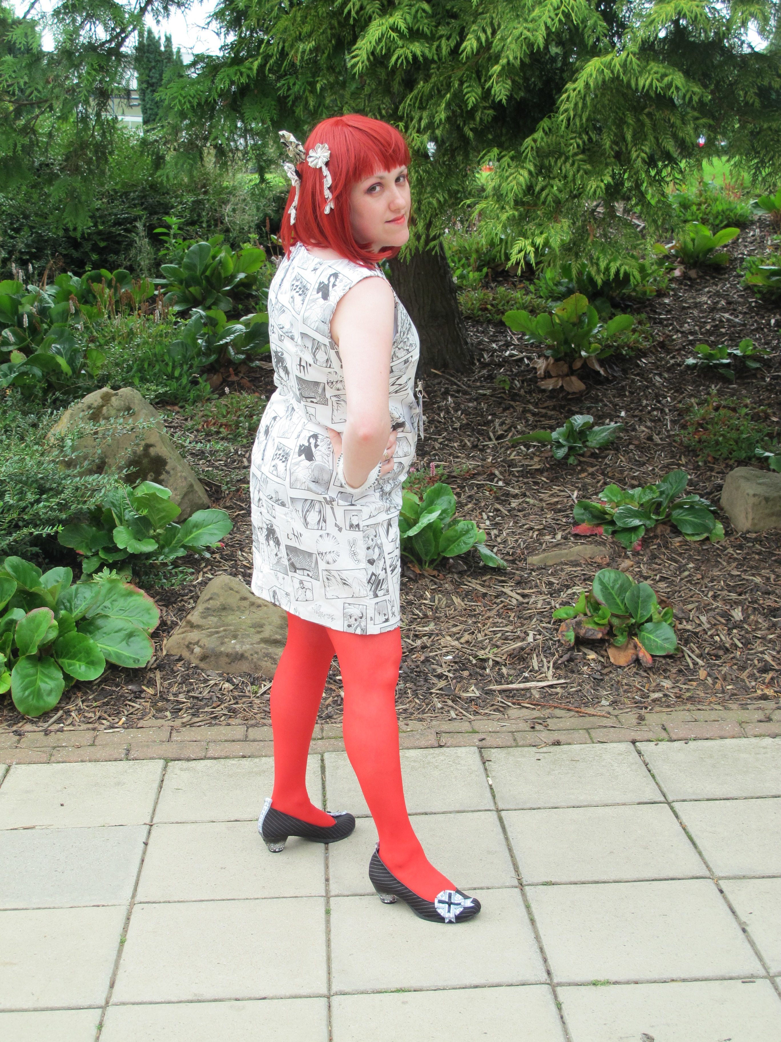 Kitty Heaven is mom to a two-year-old, and she made this dress herself. She had the manga print she designed printed up by Spoonflower, who we adore. She made the kanzashi in her hair from manga pages.