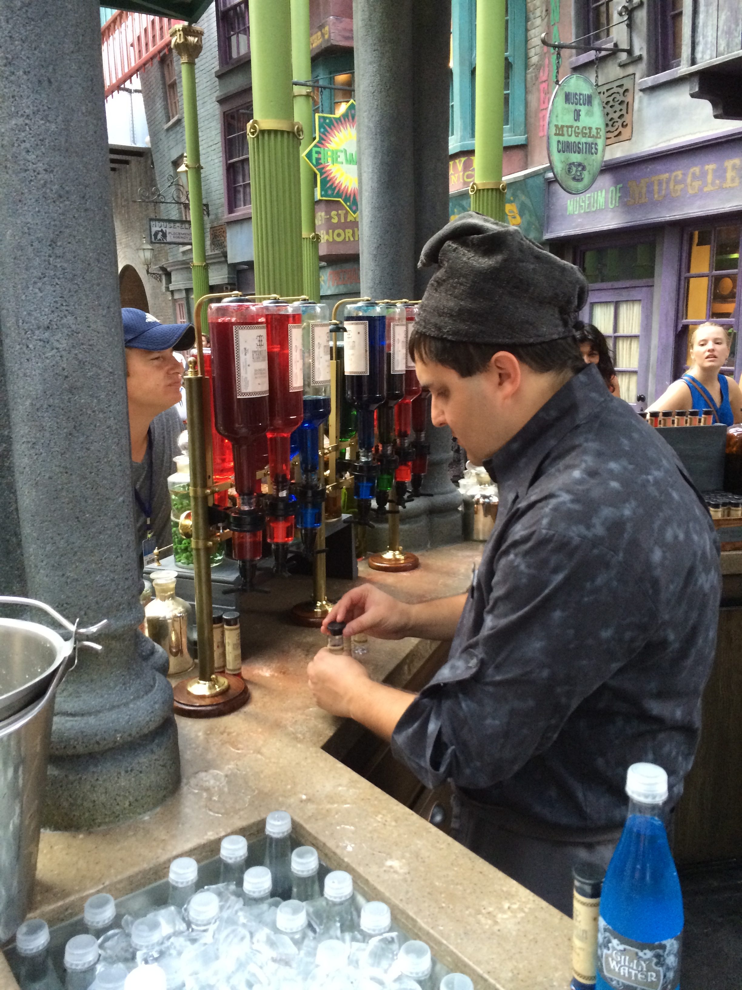I learned the hard way that talking to a wizard with your wand in your hand can result in an unplanned shower. (On the upside, the wizard I was talking to felt so bad for me that he treated my family to Butterbeers while I dried off.)