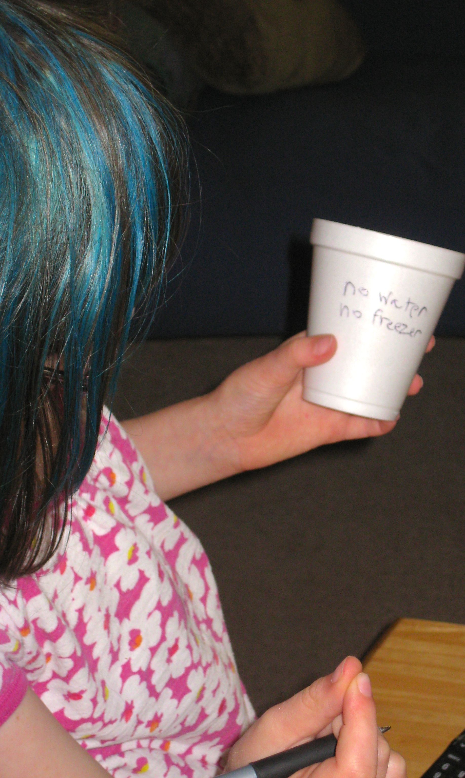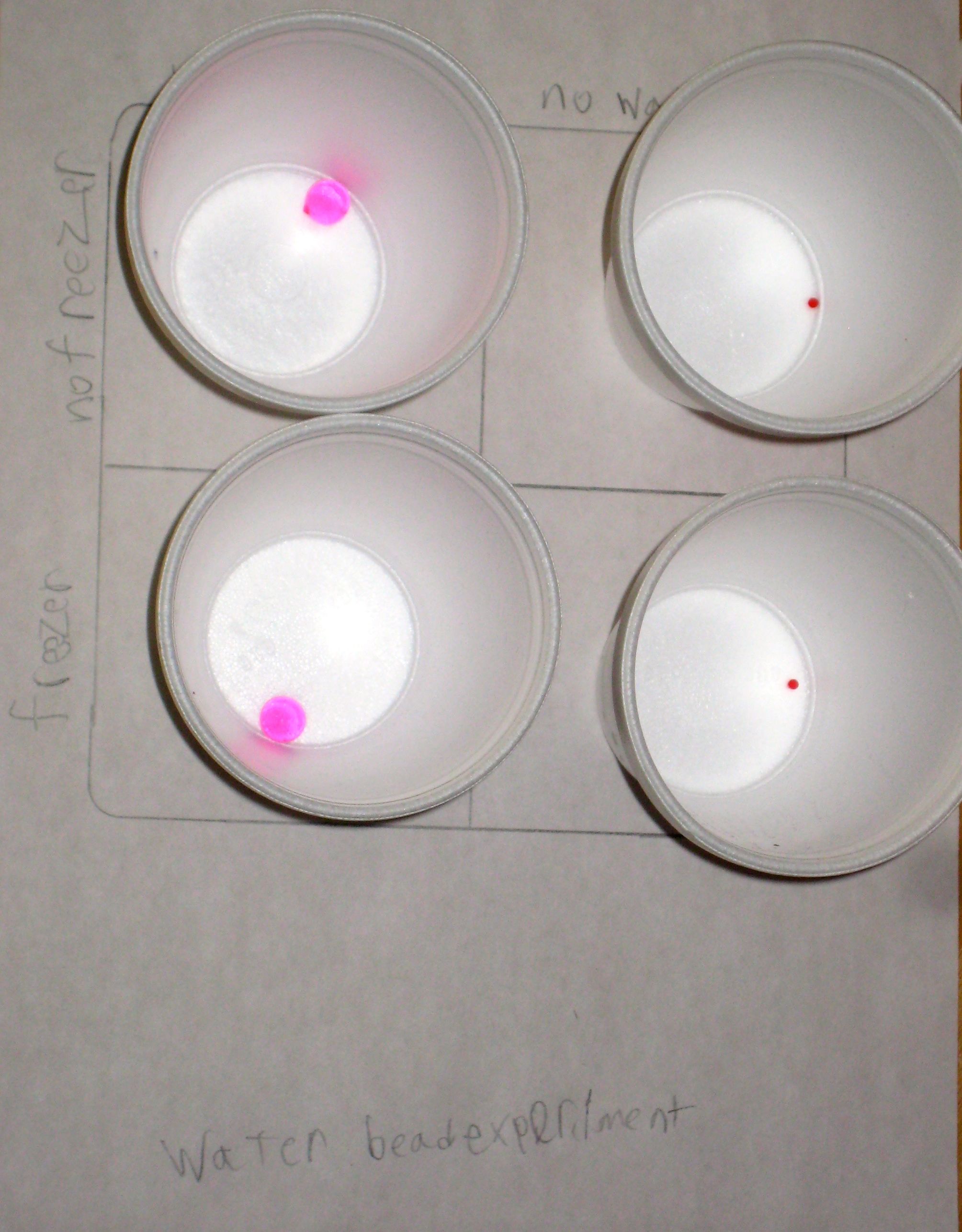 Because the beads went through so many changes, VIP and her dad decided to do an experiment: What made the beads change? Was it the water, the freezer, or both?