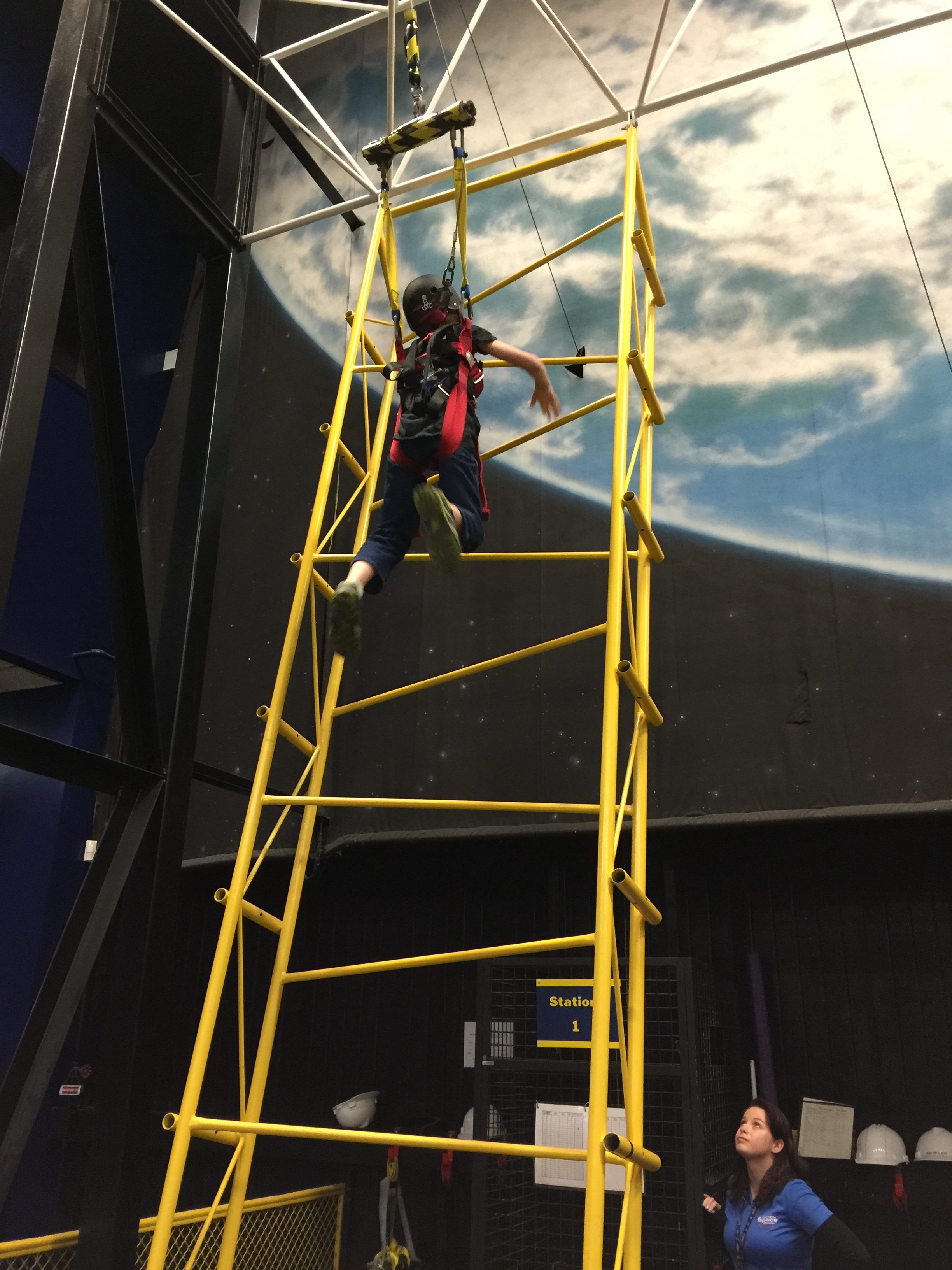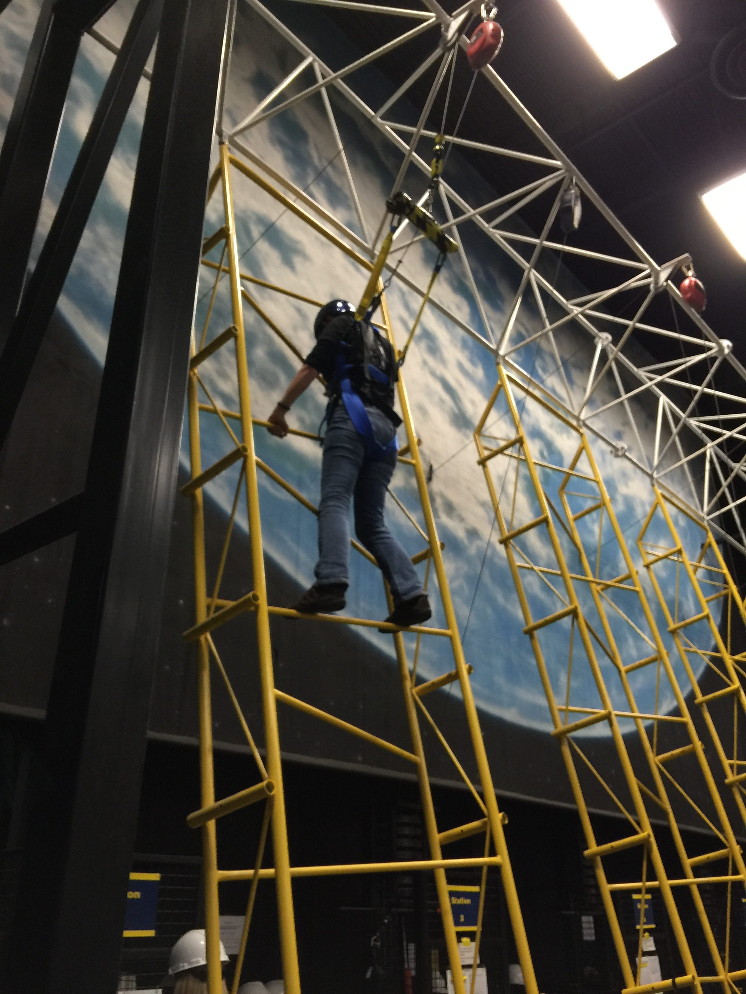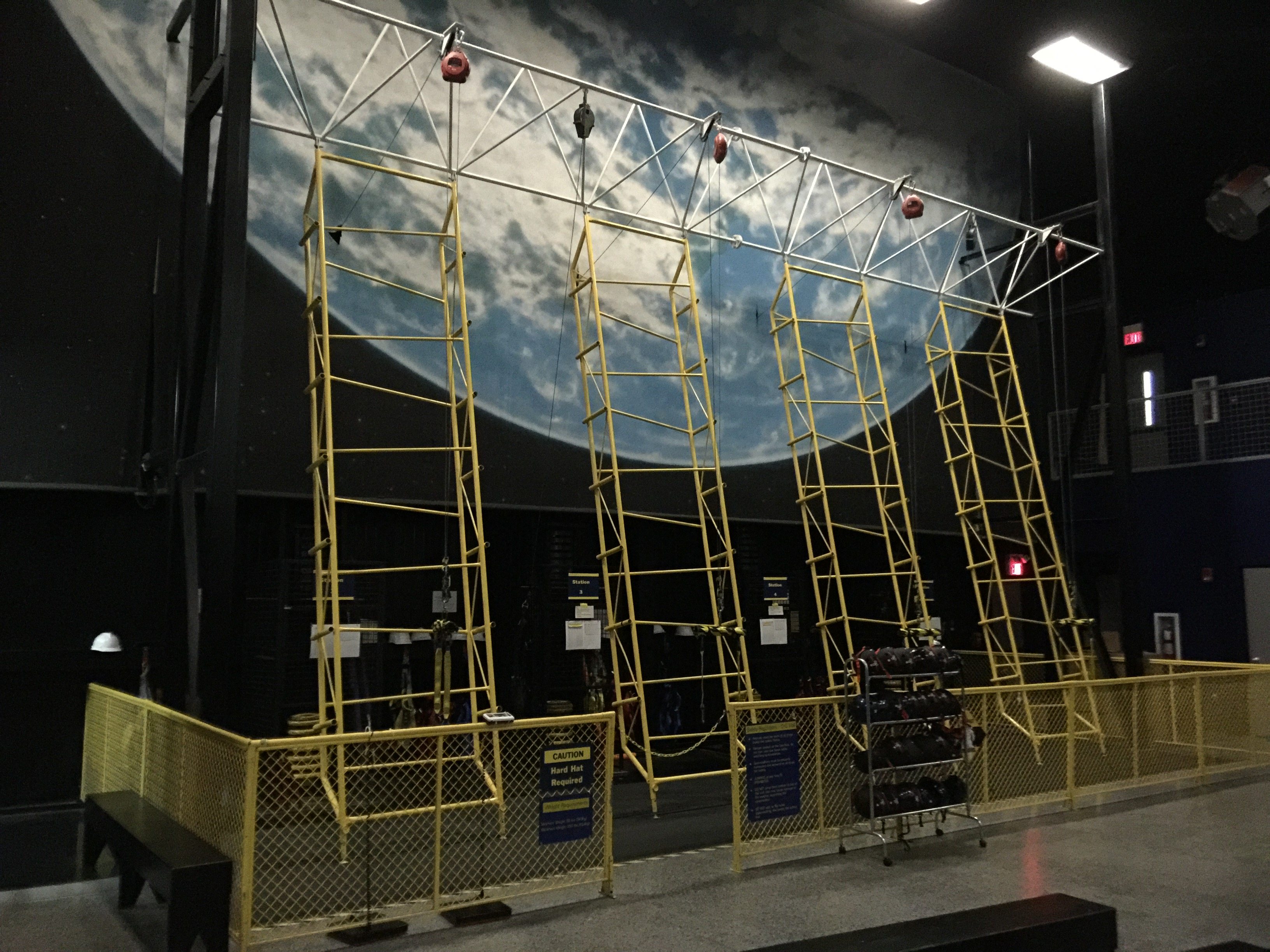 The Zero G wall is a 50 foot high ladder-like structure with a pulley system. Before you are suited up, you are weighed so that your weight can be matched on the other end. With the weights balanced, you get the feeling of zero G.