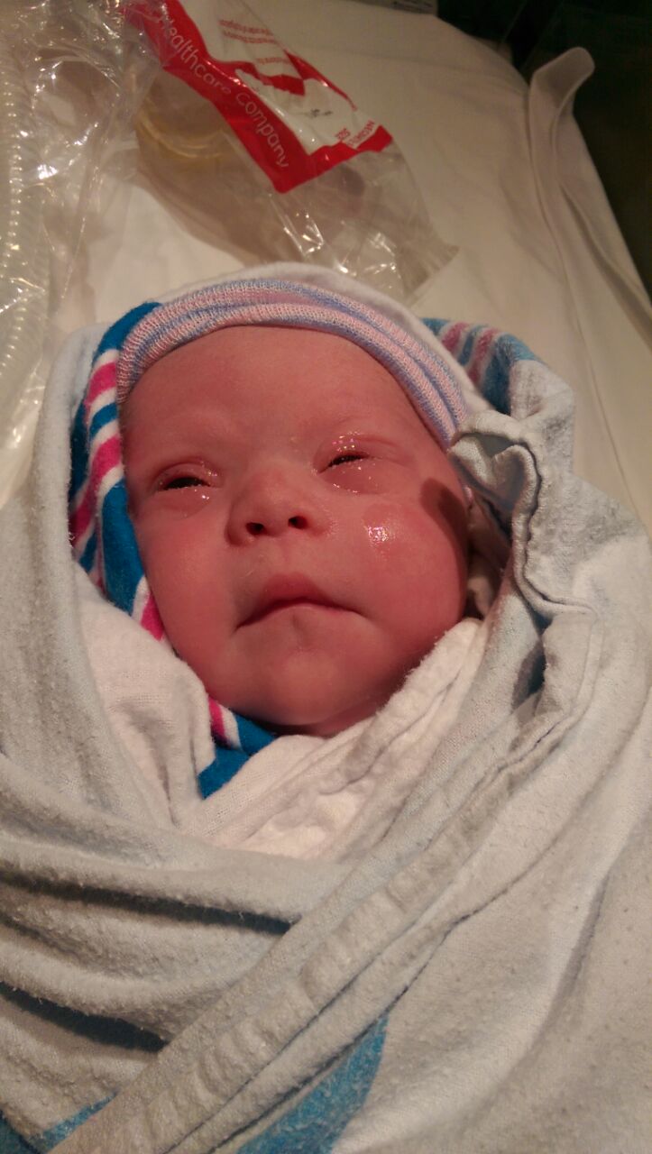 That was the easy part of the night. Within 20 minutes I was in the OR, having my placenta manually removed. Chuck was in NICU. I hadn’t even seen his face. I asked Avraham to get a picture of him for me, and as I made my way from recovery to my hospital room I looked at this new little stranger on my husband’s phone, a mix of our 5-year old and some typical Down Syndrome features.