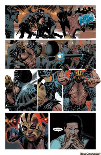 In the closing pages of the issue, Sam, watching on his own screen (long story, cut the guy some slack), meditates on the nature of change. On not only on the probability of it occurring but on the possibility of actually making a difference in a world where even those with the best of intentions are berated, smacked down, and sometimes actively hunted. Sam has been working hard, for years, toward that change. Joaquin has done the same, leaving supplies at the Mexico-Arizona border for refugees and immigrants so desperate they’re willing to risk their own lives, their children’s lives, for the chance at something better. Rage has gotten bloody and battered striving for justice for his community.