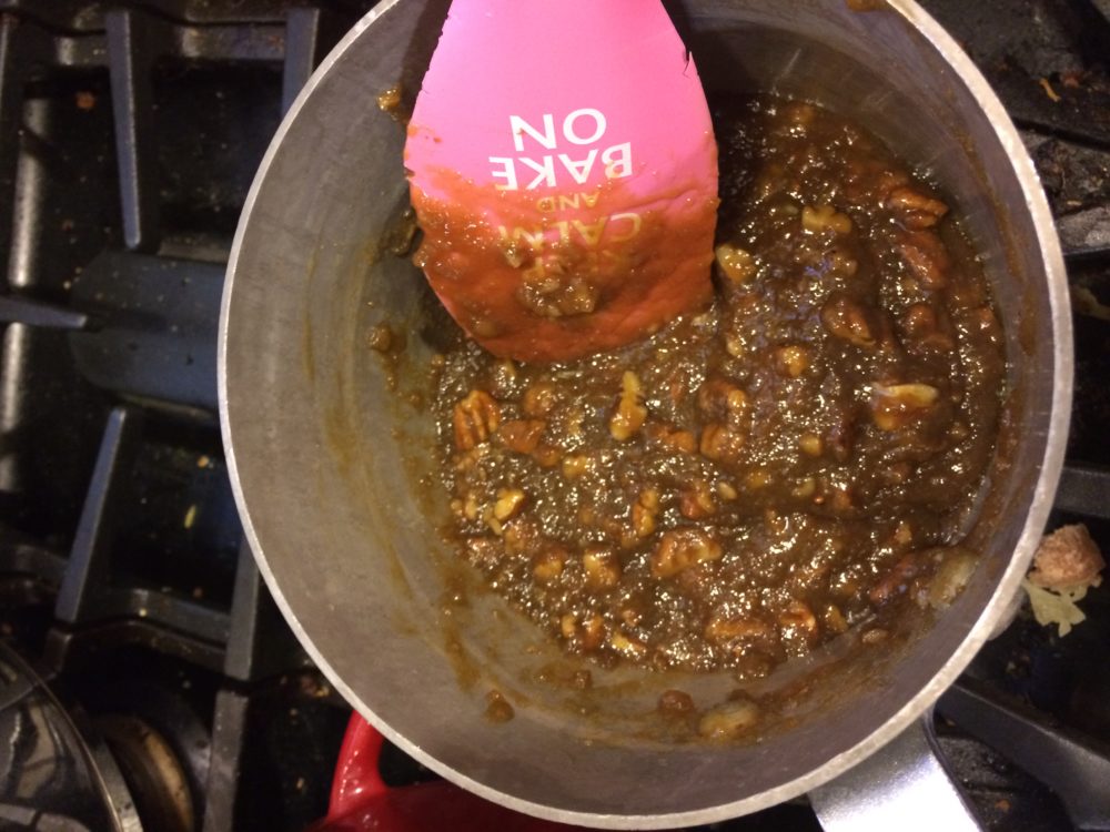 As you can see, the pot I used to mix/cook the filling isn’t anything special. It’s also about a million years old. The rubber on the handle actually conducts heat instead of buffering it at this point and I’m forced to admit I’ve lighted more than one tea towel on fire using them to prevent injury. I do recommend silicon spatulas for sticky stuff because it’s easier to clean hardened sugar and caramel off of plastic than it is off of wood but silicon certainly isn’t necessary.