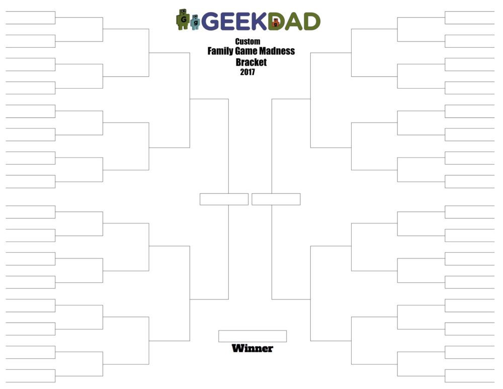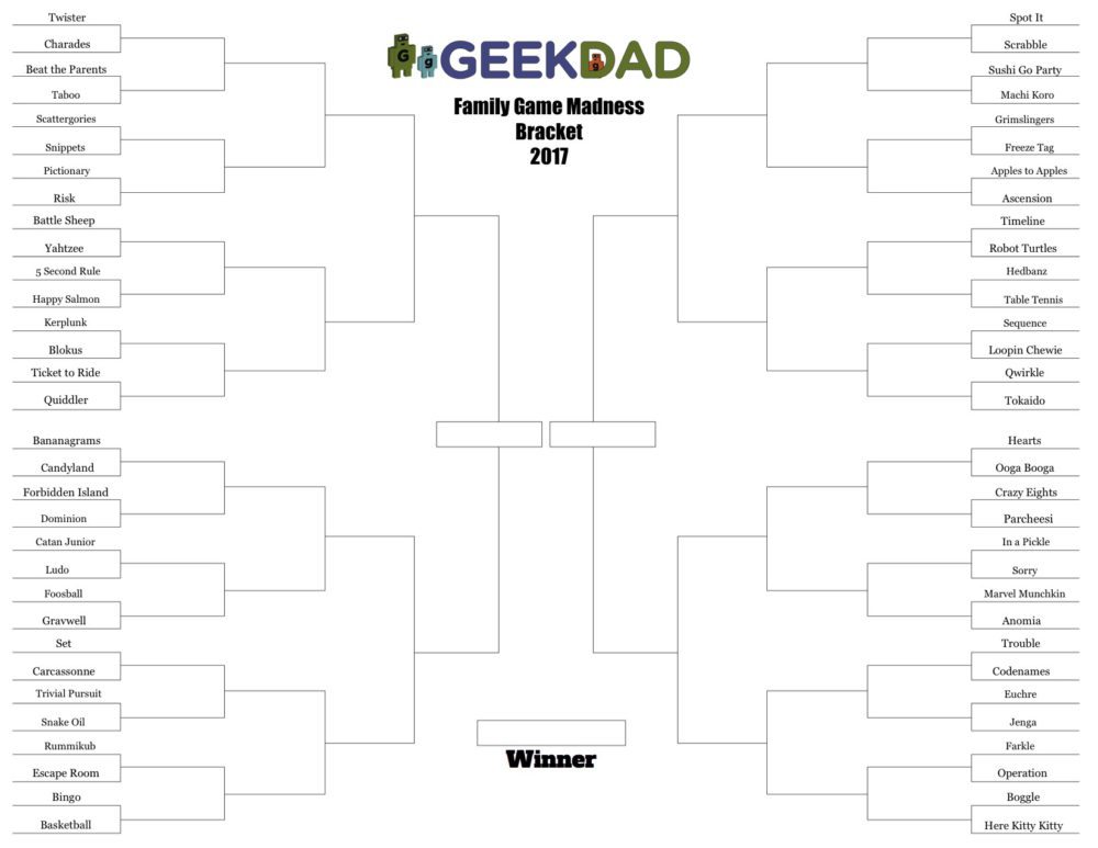 It’s that time of year again, when sixty-four basketball teams from NCAA colleges compete to determine who is the best. And when fans of basketball enjoy predicting which teams will win. What if, in an effort to teach kids about how brackets work, to gear them up for future NCAA brackets, or just to have something fun to do if you’re not so into watching basketball, there were a bracket of a different sort. Presenting, the GeekDad Family Game Madness Bracket.