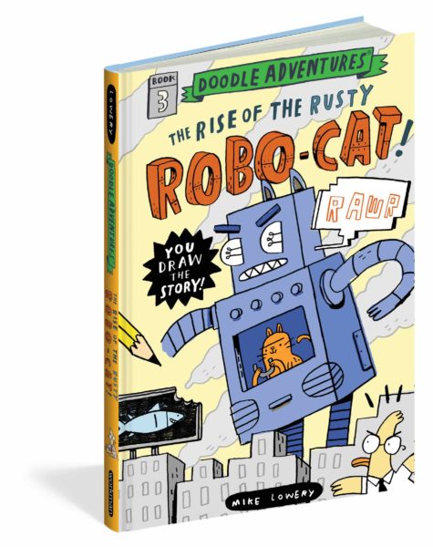 Workman Publishing was kind enough to send my family a copy of Mike Lowery’s newest Doodle Adventures: The Rise of the Rusty Robo-Cat! for review and we couldn’t have been happier to find it on our porch, crack it open, and doodle like heck. The kids absolutely adore this interactive series, giggling at Carl the grumpy duck, competing (in friendly fashion, of course) to see who can draw the most outlandish illustrations, and taking great satisfaction in their contributions to the story. As a parent, and a writer, I love the level of engagement they find in the Doodle Adventures and the ways in which it teaches them about storytelling and character development.