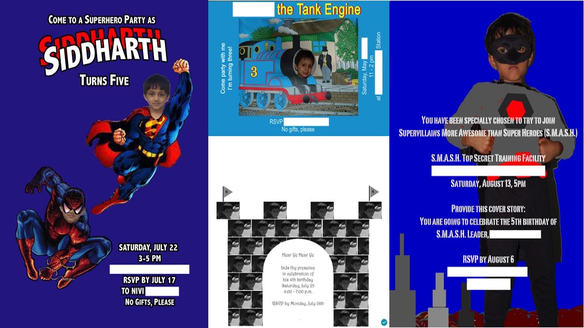 Every year, we have a party for their birthdays. For many of those parties, I designed their invitations in Photoshop. I could probably gather these into an album. In fact, I should probably find copies of all of them. Here are a few examples: