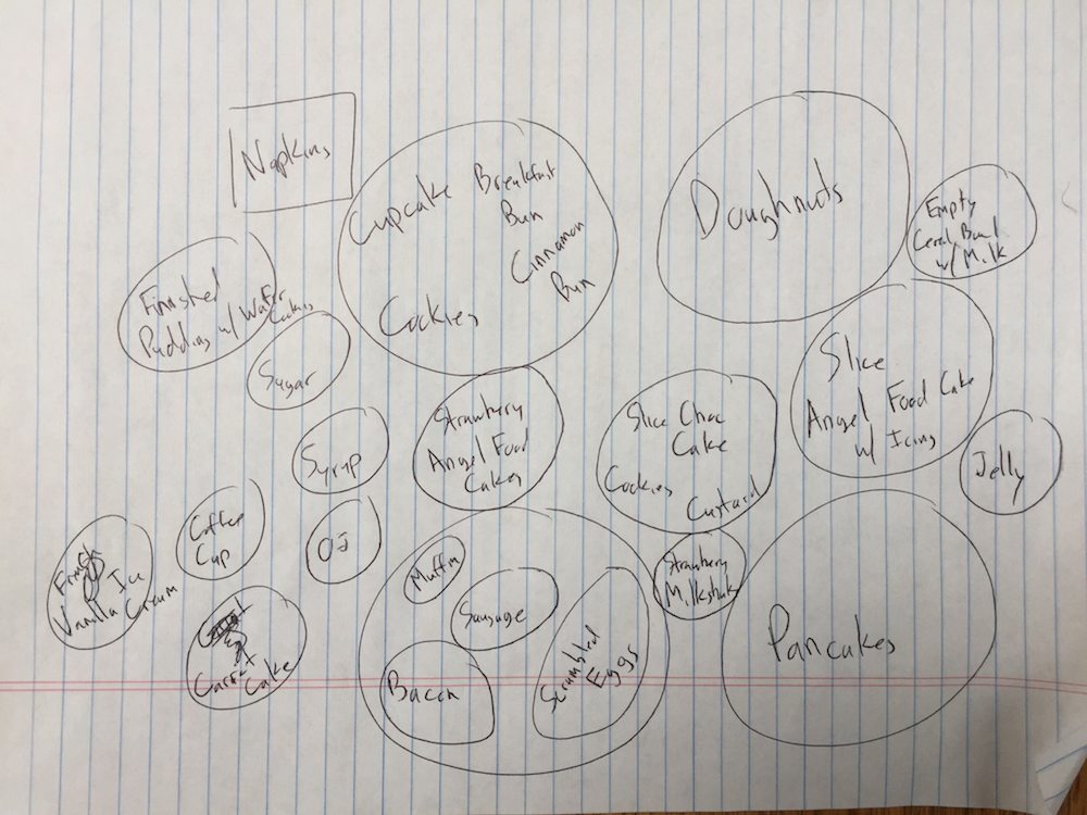 The day of the shoot I sat down with two stills from the movie and sketched the layout. We wanted it to be as close as possible to the scene. With plan in hand we were able to determine what we had, what we could make, and what had to be bought.