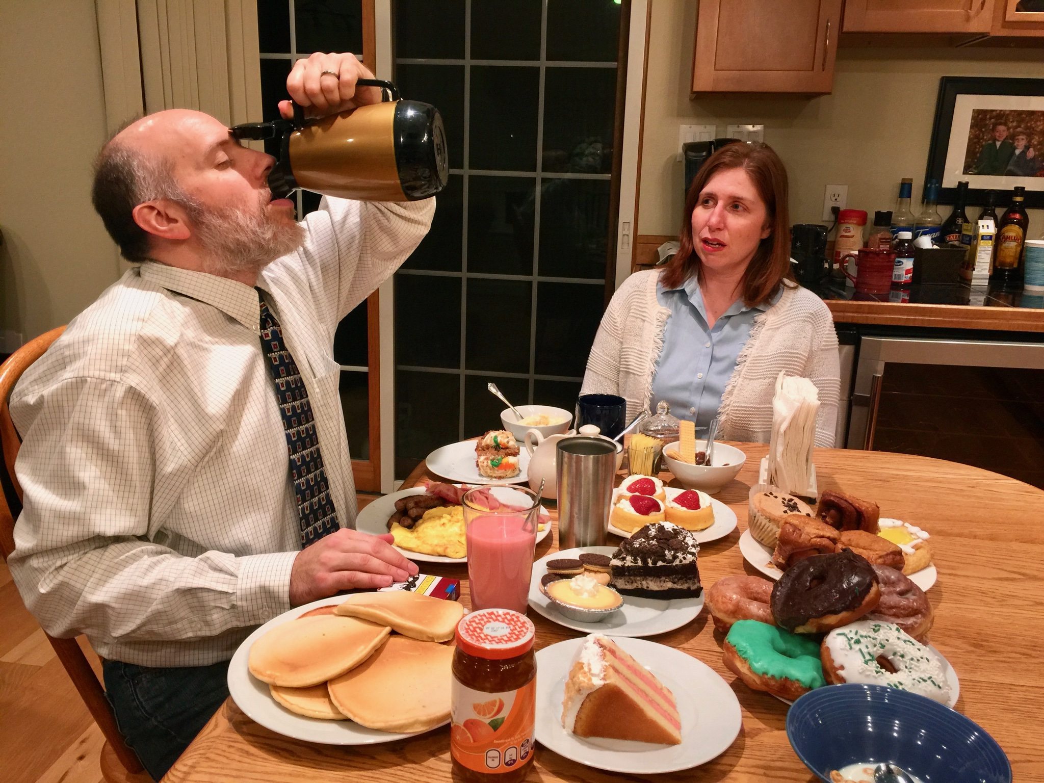 By this point in the movie, Phil is clearly in his “let me see what I can get away with” phase. This image was so spot on, I showed it to a couple of fellow Geek Family writers and several of the movie’s fans could pick out the scene right away. We had so many questions about how they made it happen. As as you know, when GeekMom and GeekDad have questions, we won’t sleep until they’re answered! I asked Tony (guzzling from the carafe in the photo) and Colleen (staring incredulously) about their inspiration for replicating this scene, as well as the logistics of making it happen: