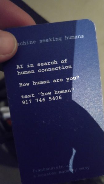 One more note on the concept of AI. My son and I happened to stumble into a very unique experience where the goal was to get as many people as possible to input what they feel makes a human, in an attempt to create an actual AI that had human qualities. It was called Frankenstein AI: A Monster Made by Many, a nod to the famous Mary Shelley book, where a young scientist creates an artificial human and it creates unique issues. We entered a quiet room with a handful of people then sat face to face with a stranger and answered questions, which had to do with experiences in our lives. This information was then saved and put together with many others, and by the end of the festival the team had an AI that took the human characteristics from the combined input through the week. Since we didn’t stay to the end of the festival we didn’t get to see the end product. But it was exciting to be a part of the process.