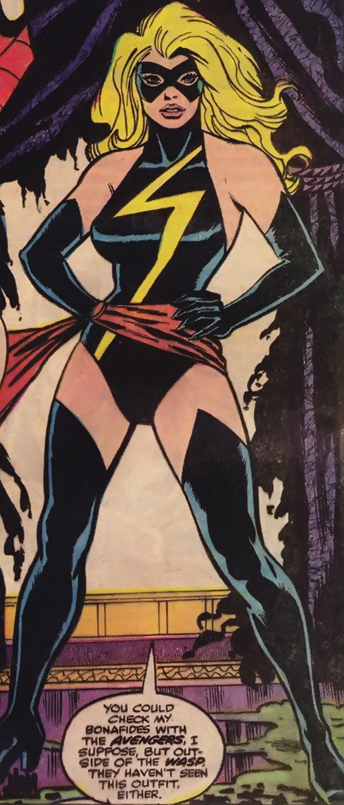 Highlight: Ms. Marvel joined the Avengers and her cool costume with the high black boots, and lightning bolt became the standard.