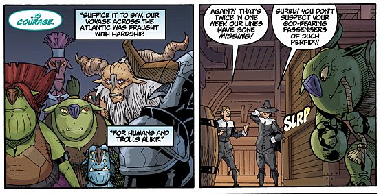 Blinky’s tale briefly covers the dismantling of the Killahead Bridge, a truce between Trollkind and humans, and the journey Trollkind takes to a new land in search of a new Heartstone. This journey coincides with the Mayflower leaving Plymouth for the New World with the trolls stowing away onboard.