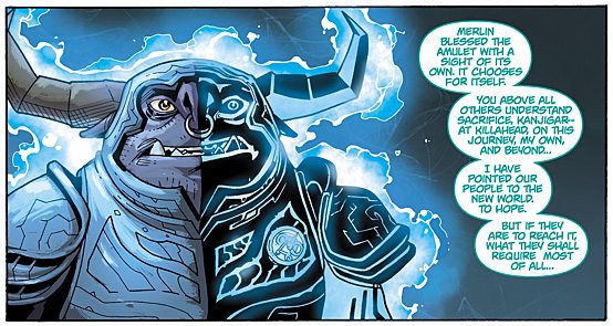It is worth noting that the violence in the book is significantly more graphic and intense than is seen on the TV show, placing it closer in tone to the Trollhunters YA novel than the animated show. In one panel, a troll is seen plunging a sword through the head of another with resulting blood splatter and in another, a troll cuts a hole through the stomach of a mountain roll, launching himself through it to emerge out of the top of the mountain troll’s head. That being said, my sensitive eight-year-old read the book with his dad and didn’t find any of the violence upsetting.