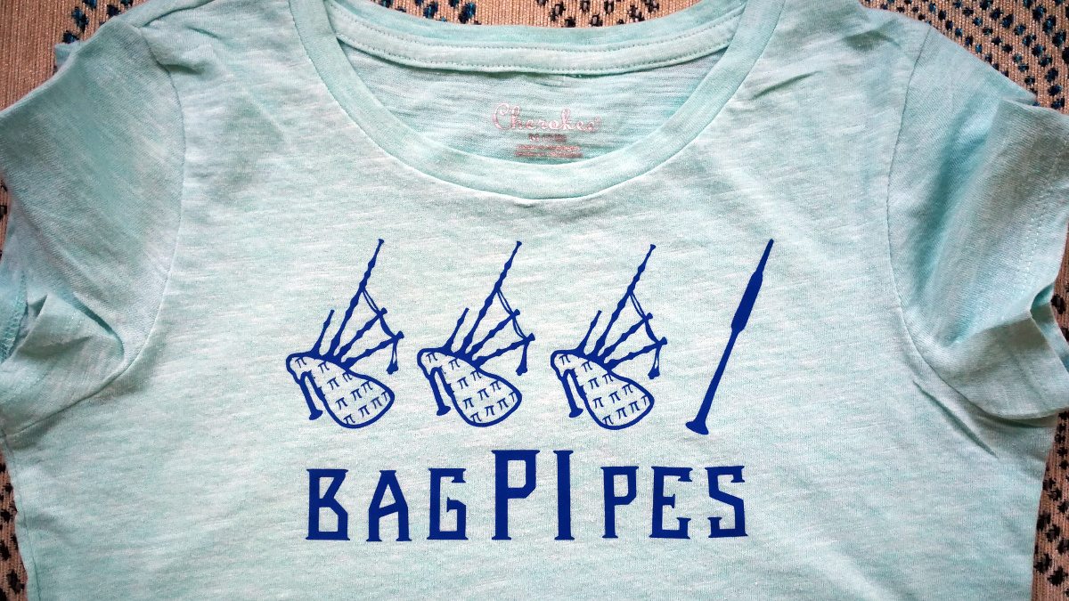 For my daughter’s class Pi Day celebration, she wanted something different, and we came up with the “bagPIpes” design in the photo above. I created the file largely by importing into Cricut Design Space, which unfortunately means the file can’t be shared directly. You can download my SVG of the design with everything but the small π symbols inside the bagpipes. I added those as text directly inside Design Space, which will make them cut better. (Similarly, if you would like to add the text directly, the font is Bearded Lady.)