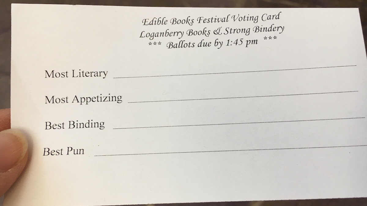 Earlier, while I had spoken with Ms. Strong, she reflected on why this event resonates with her, and likely echoes with those who attended. The Edible Book Festival succeeds, she explained, because it’s about “books, which I love, and food, which I love.” The record-high 92 voters certainly agree.