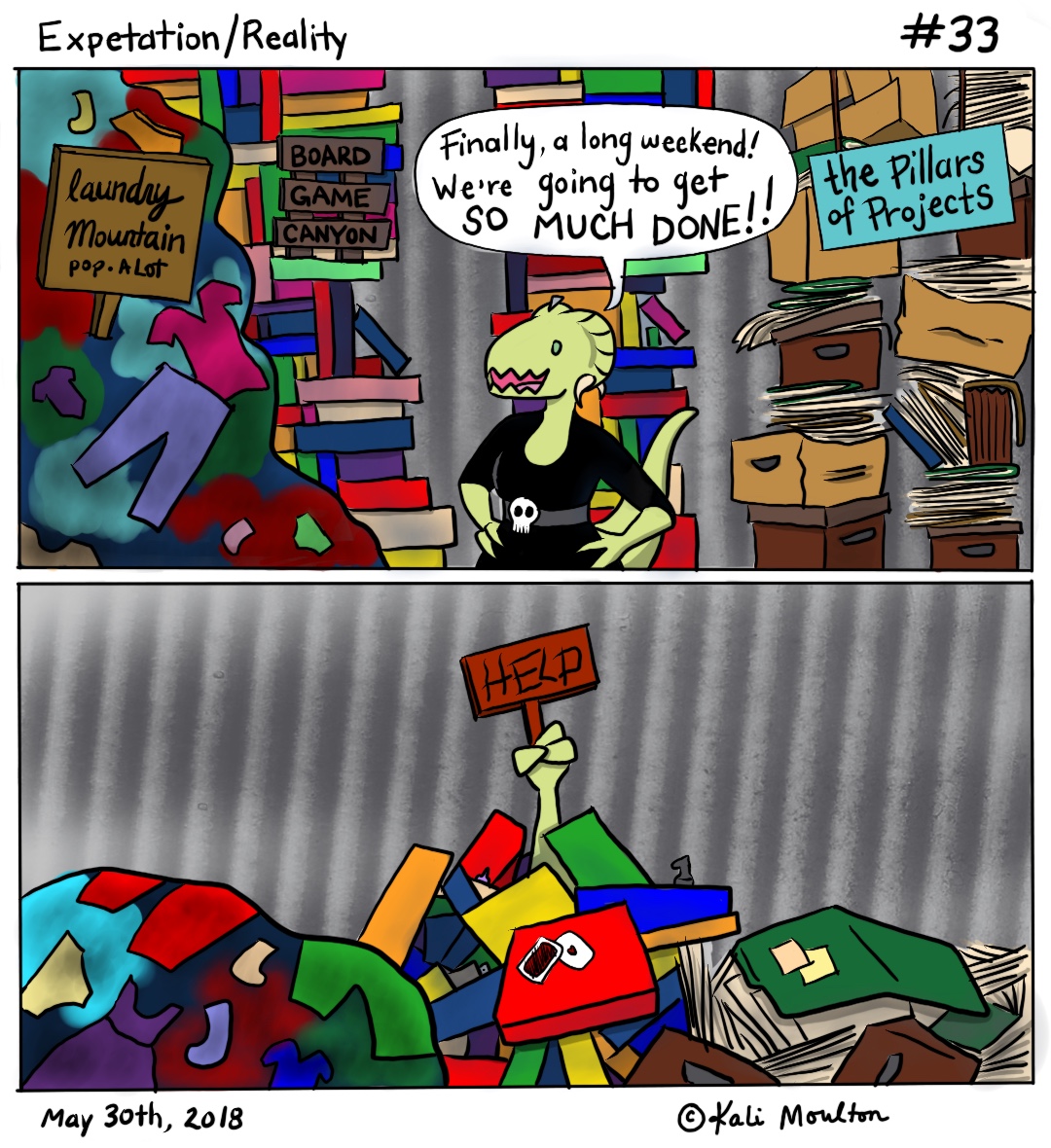 Sometimes when we have a million things to work on, my husband and I put unrealistic expectations on how our plans will unfold. For example, this weekend we were somehow going to clean the house, build a Ghostbusters roof rack for the minivan, sort through over 1000 board and card games in our basement, and visit family. On top of all of that, I was going to write 10,000 words for my novel and somehow squeeze in an art commission, brunch with friends, a workout, and a shower.
