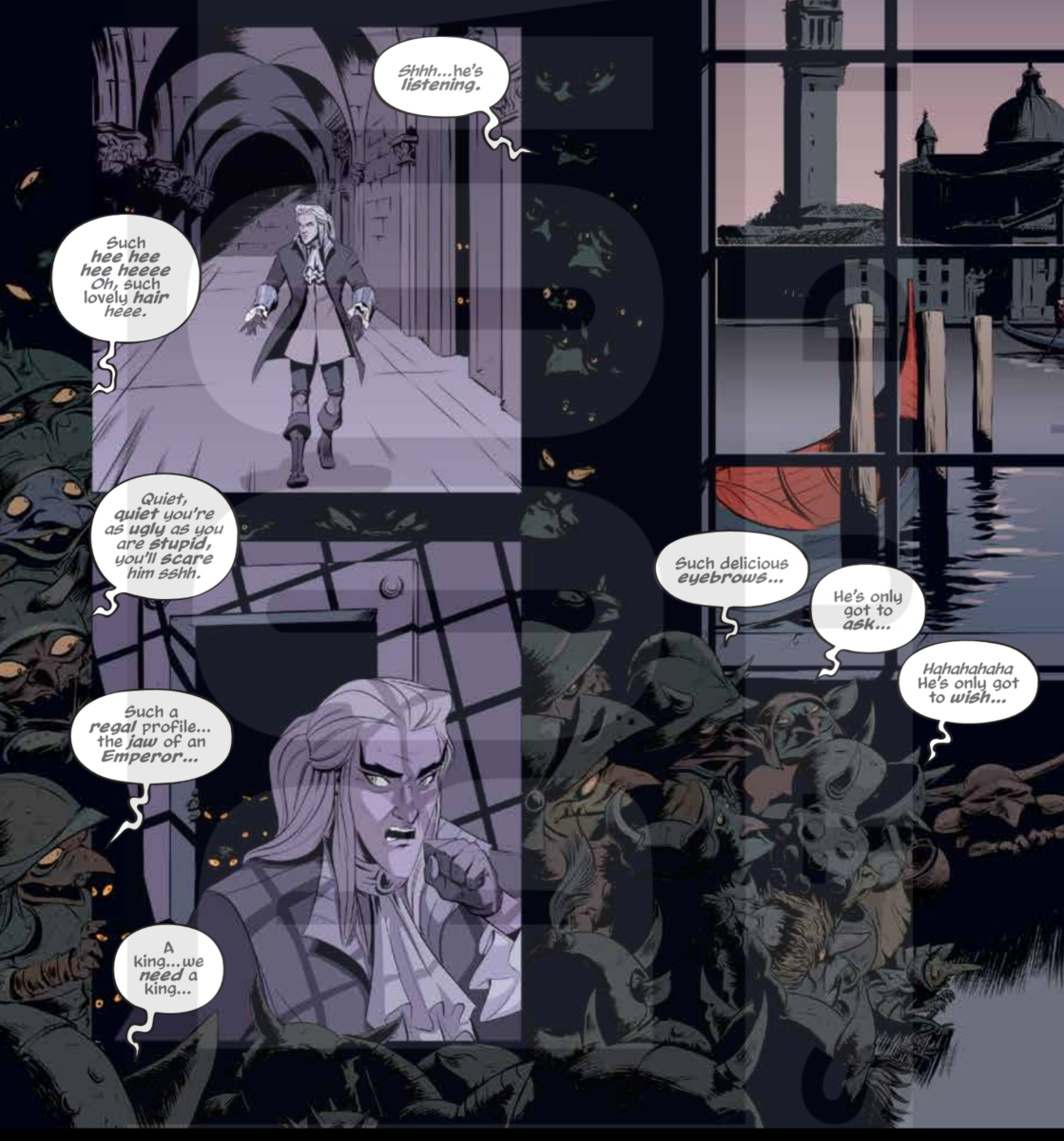 After this, the setting moves to Venice in 1797. We see a grand ball, reminiscent of the dream Sarah fell into after she ate the poisoned peach. We meet Maria and Albert; although they play the roles of Count and Countess, Albert is some sort of English nobility fleeing debts from across Europe while Maria was a linen maid who passed herself off as nobility to win a marriage to Albert, who bears a clear resemblance to Jareth in the movie; the first panels where he is alone, we see the goblins in the gutters, whispering and talking about him the same way they whispered and talked about Sarah. “A king…we need a king…he’s only got to ask…he’s only got to wish…and the crown is his…”