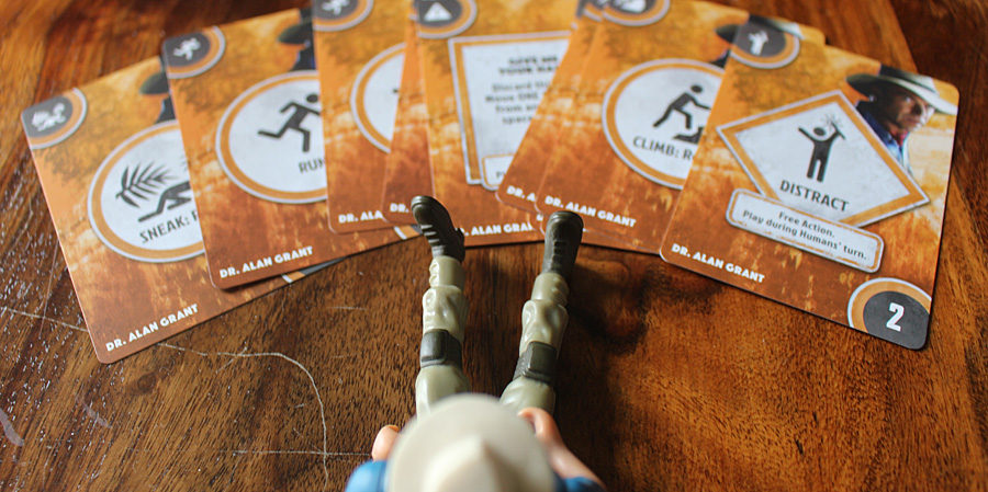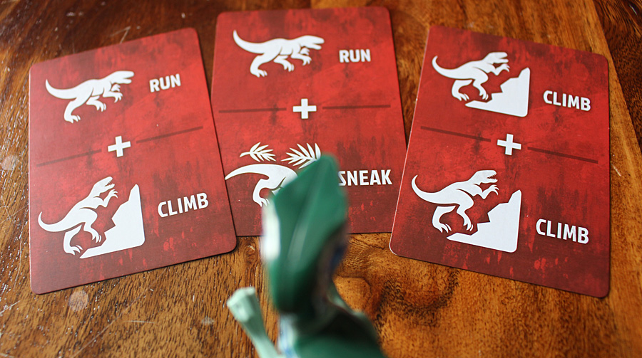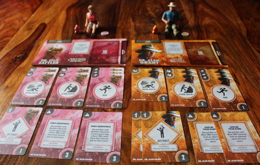 For example, John Hammond needs to climb. In order to do so, he needs to roll a four or higher, but here he has only rolled a one. The player chooses to burn one of his sneak cards with a value of three to make up the difference and allow John Hammond to successfully climb to an adjacent space.