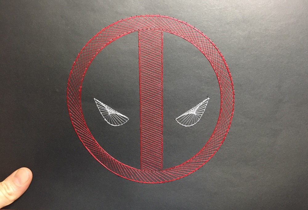 Yes. Megs has provided excellent instructions. It’s a matter of matching her diagrams with your pre-punched cardboard and then count. Start from the back of the cardboard, come out towards you at Hole #1, go through to the back again in Hole #2, and follow the instructions. The Deadpool Kit is especially easy. There were a few moments where Sinister was distracted and missed a spot but it is also very easy to fix mistakes. The other tricky bit is making sure your thread is firm but not tight. Too tight and you run the risk of ripping the cardboard (don’t panic – you can fix it with sticky tape). Too loose and the thread just hangs a bit. This comes with practice.