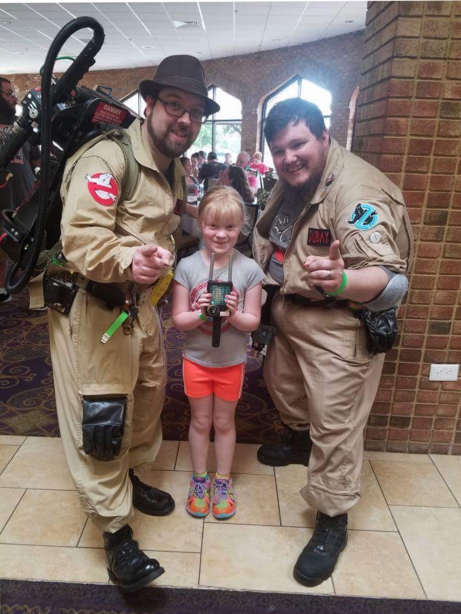 Wayne Moulton (left), an amazing child with super cool sneakers (middle), and Frank DuBay (right) of the Bay State Ghostbusters, Kids Con New England, 2017