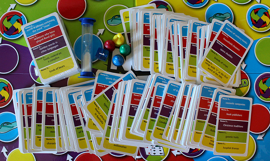 Teams take it in turns to roll the dice and move that many spaces. A player from an opposing team then takes the top card from their pile and reads out the category which corresponds to the colored space the active team’s pawn just landed on. Once the category has been read out, the sand timer is turned and the active team has 30 seconds to name five things which fall into that category. If they succeed the team takes another turn (up to a maximum of three), but if they fail, play passes to the next team.