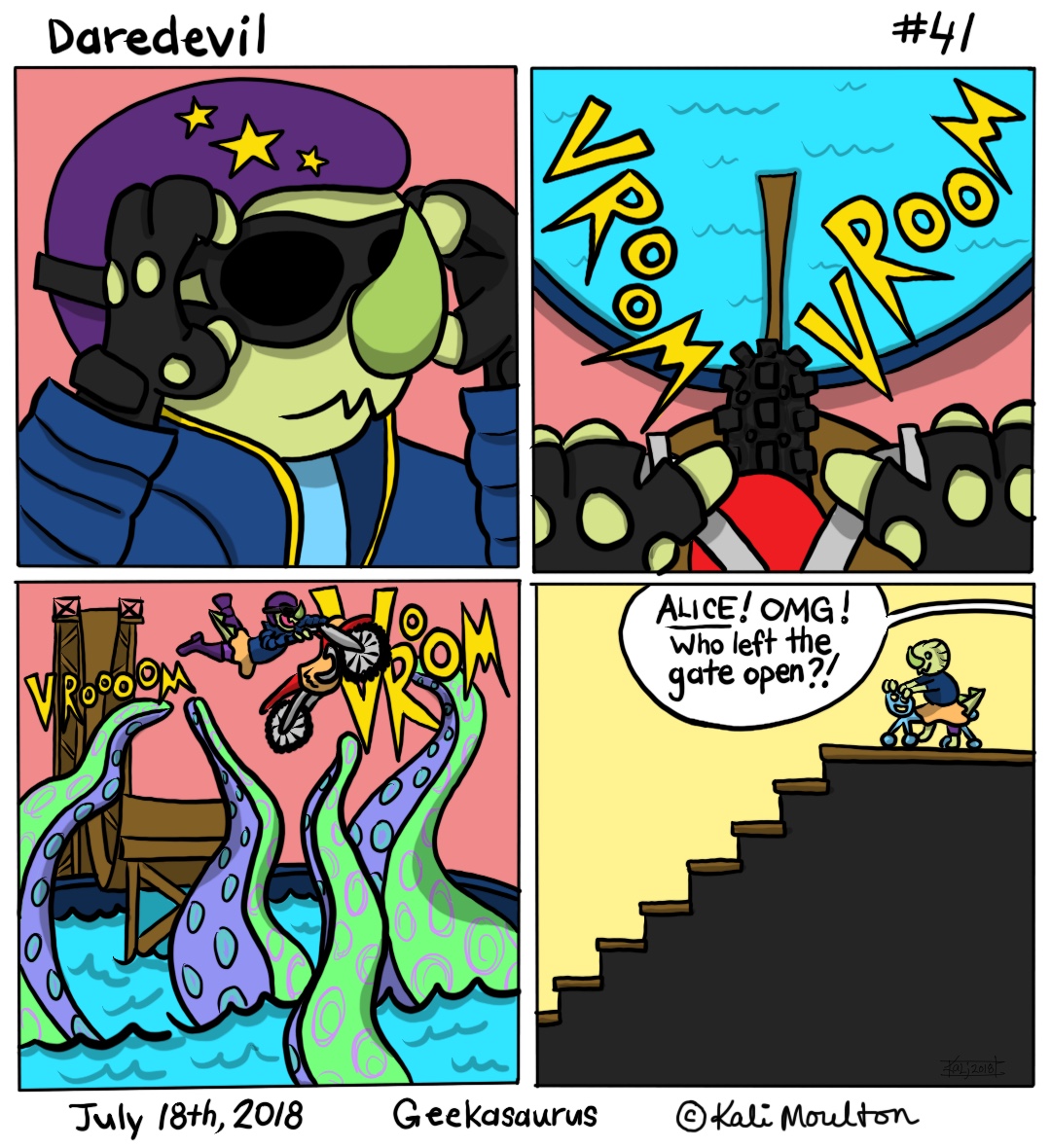 I have a daredevil child and I’m sick. All I want is to sleep it off with Sudafed and Aleve but work-from-home parents don’t get sick days. I wasn’t sure if I would even get this comic finished in time. Somehow I managed to push through anyway. Now my daredevil child is crying because I won’t let her whack her iPad with an aluminum magic wand while standing on the ottoman that we use as a coffee table like trendy people do in the magazines. Le sigh. So much for my nap.