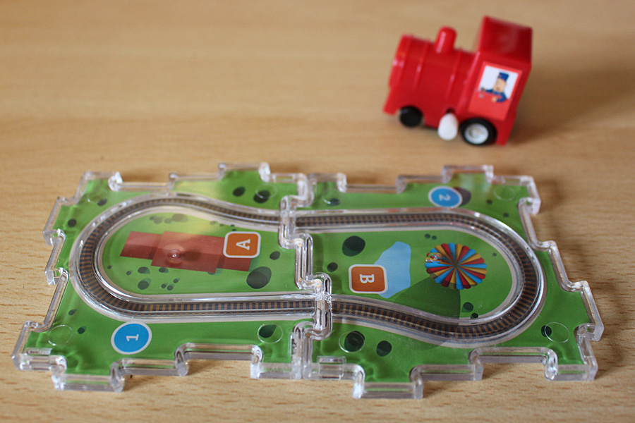 I do have some issues with the game. The train itself is made of very cheap plastic, and the grooves on the track pieces are a bit too shallow, so if the train is wound too hard it tends to go shooting off the track rather than following it—especially considering how fast it goes (that video footage above has not been sped up!). Conversely, if you don’t wind it up enough, it will struggle to get around corners which can get rather annoying after a while—particularly on the larger, more complex tracks. The puzzle book has been printed so that it is larger than the box, which means it has to be awkwardly folded in order to fit inside, and finally, the packaging contains a lot of plastic which could easily be replaced by a cardboard insert in order to make the game more environmentally friendly.