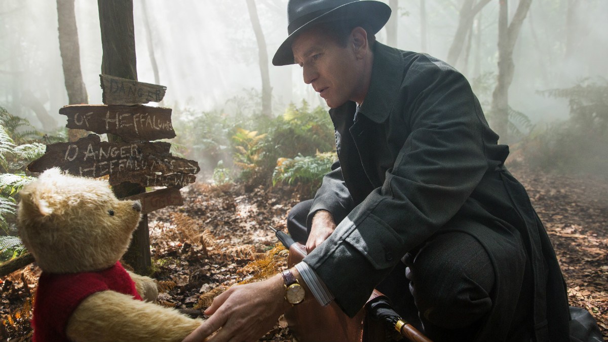 No, which to me seemed strange, though not exactly disappointing. The movie’s title character has “Robin” for a last name, instead of a middle name as it of course was for author A.A. Milne’s son. In the world of the movie, all the young Christopher’s escapades in the Hundred Acre Wood were real, and his father wrote no stories. Thus he was never famous as the real Christopher Robin Milne was, which I’m sure was the main reason they chose to base the movie on a completely fictionalized version of him. The movie’s grown-up Christopher (Ewan McGregor) serves in World War II, marries, and has a daughter – as did the real man – but his experience and his family are very different.