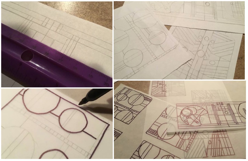 Using Wright’s favorite design elements we mentioned, create a pattern based on a favorite fandom, or just play with the patterns and make them your own. Draw the image on a plain sheet of drawing paper, not the vellum yet. This way you can erase it without smearing or messing up the vellum. Use a compass or small glasses or lids for circles, and a straight edge ruler for lines to make your design as tidy as possible.