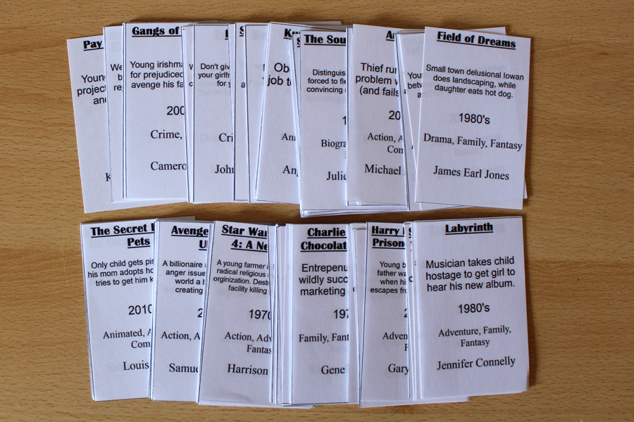 To play the standard version of the game, five cards are dealt to each player and the player who most recently watch a movie goes first. This player chooses a card from their hand and reads out the description of the movie to the other players who have the chance to guess what it is. If no-one can guess the movie, the player reads out the first clue – the decade – and the other players get to keep guessing. If no one can guess correctly the second clue – the genre – is read out, and then the final clue – the actor/actress.