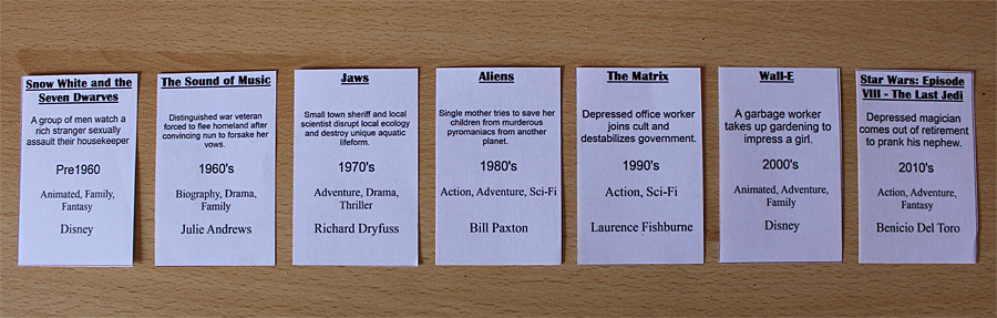 It is worth noting that this is a game intended for adults. Younger kids will struggle to play because they are unlikely to know many of the films and the descriptions are often inappropriate to read out with young kids around – even on films they have a chance at knowing such as Sleeping Beauty or Snow White. While you could, in theory, cull the deck in advance to only include films your kids know, and descriptions you’re happy to read out, I’d personally recommend this game for teens and up because the kind of warped thinking needed to figure out many of these cards will be difficult for kids.