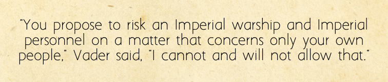 Of the two, I generally found myself preferring the Clone Wars-era story. This is mostly because this story felt more focused in its storytelling. The Rebels-era story included a large array of minor characters and the story would frequently shift between their perspectives, including Thrawn, Vader, and several senior stormtroopers and Imperial officers aboard the Chimaera—Thrawn’s Star Destroyer. I often found myself getting mixed up about who was who, especially during action sequences where all the characters would be doing things simultaneously. The Clone Wars-era story, on the other hand, limited its perspectives to Thrawn, Anakin, and Padmé, which lent it a far more cohesive feeling. That being said, my favorite alliance in the book is easily the uneasy one between Vader and Thrawn in the Rebels-era tale. There is a palpable tension between these two during every interaction, and it’s interesting to read about Vader’s thoughts and feelings as he begins to understand Thrawn’s unique style of leadership and thought process. I did feel that Vader’s dialogue was slightly off at times. He simply felt too chatty for the character, but then, if he had been less so, the book would have felt extremely one-sided.