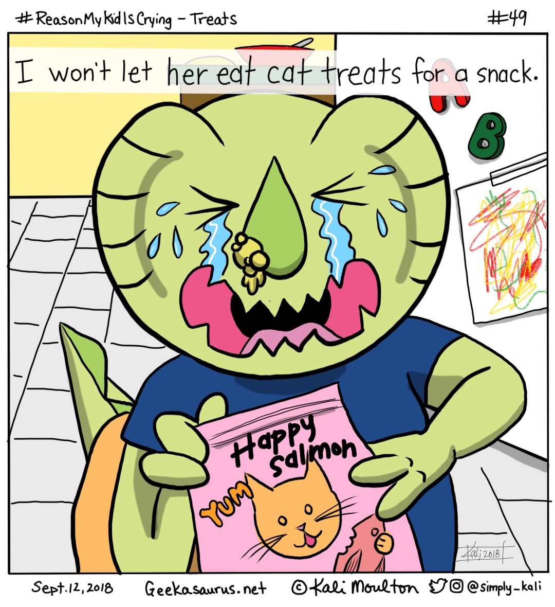 Maybe it is because they come in the bright packaging like her yogurt snacks. Or maybe it’s because they have “Seuss” on them (Seuss is our cat and all cats are Seuss). Or maybe it’s from the handful of times that she’s stolen the kitty’s treats from Seuss and scarfed them down, but my little Dinosaur REALLY wants to eat those soft salmon morsels and she will totally tantrum if I don’t give them to her. (I don’t give them to her.)