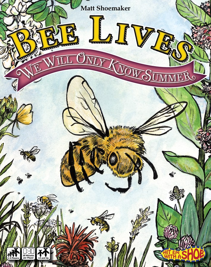 Bee Lives: We Will Only Know Summer is a worker placement game for 1 to 4 players, ages 14 and up, and takes about 30 minutes per player. It’s currently seeking funding on Kickstarter, with a pledge level of $49 for a copy of the game. The theme is family-friendly; the age rating is based more on the game’s complexity and length. It’s a Euro-style game and may be a bit much for younger players who don’t have as much experience or patience.