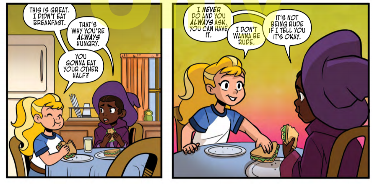 The new comic caught me off guard immediately. After a quick page showing the kind of fantasy play our two main girl characters engage in, I found myself in a world very grounded in our reality. Willow and Wisp aren’t a legendary fighter and sorcerer; they are, in fact, playing in Willow’s back yard. They vanquish monsters and defend the realm, then head into Willow’s house for a snack…but only after Willow’s mom makes it clear that the floor is cursed, and anyone with muddy shoes is going to be sent to the dungeon.