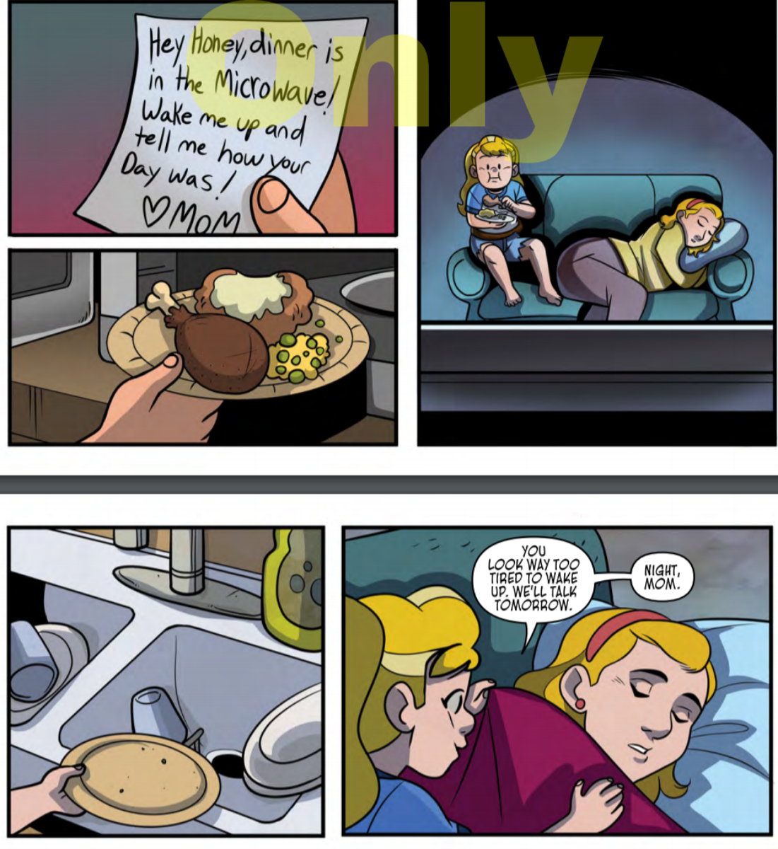 Wisp, however, comes home to a mom who has left her dinner in the oven and fallen asleep on the couch. She’s left Wisp a note, asking her to wake her up and talk about her day. Wisp, instead, eats her dinner, then puts a blanket over her mom and goes to bed herself.