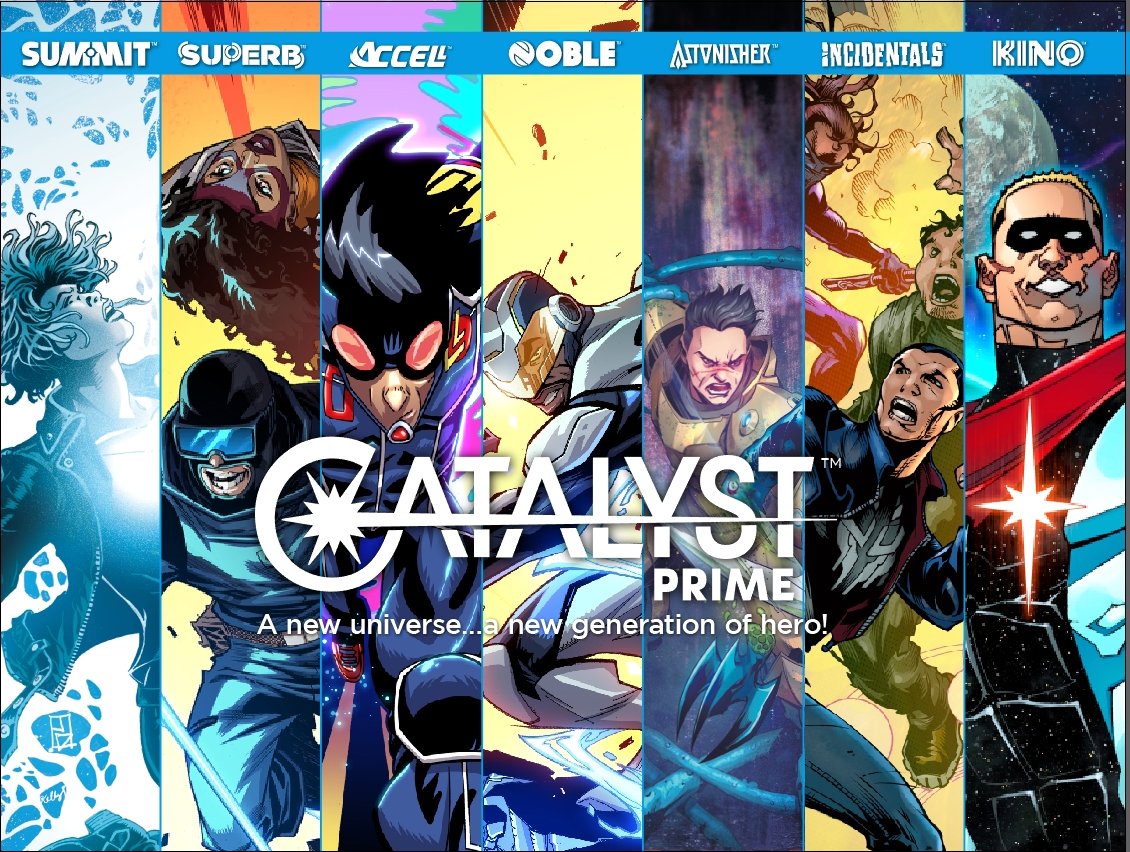 The company’s motto can be seen in practice in the creators and characters in current Catalyst Prime Universe of superhero comics, which include Noble, Astonisher, Accell, Summit, Kino, Incidentals, Superb and Quincredible.