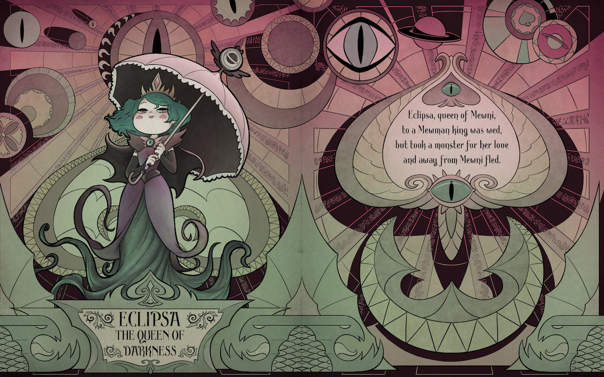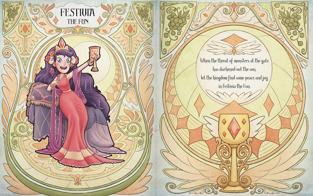 Fans will have access to the past 13 Queens. Well, 12 Queens and one not-quite Queen. They’ll gain insight into their various spells, histories, diary pages, tarot cards, secret loves! They can find out their Aureole sign, recipes for Mewni pies, and if they are really clever unlock a secret language.