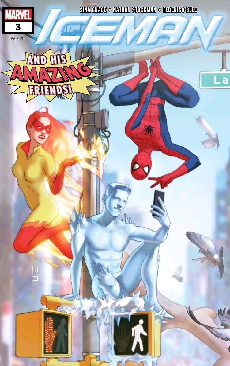 Speaking of monster of the week episodes, this month’s issue of Iceman is a fantastic example of how this can be done so well. Issue #2 ended with Bobby finally getting a match on his dating app. Issue #3 starts out with Bobby out on a date with Carlos. We also see Peter Parker (Spider-Man) out on a date with Mary Jane while Angelica Jones (Firestar) is also on a first date. A monster attacks; Spidey, Iceman, and Firestar all suit up to fight the baddy. I didn’t realize at first, but this is a direct call-back to the ’80s cartoon Spider-Man and His Amazing Friends. Having the cover issue tagged with “Iceman and His Amazing Friends,” as well as the interior joke (Spidey: “That doesn’t sound right”) gave me a laugh, once I figured it out.