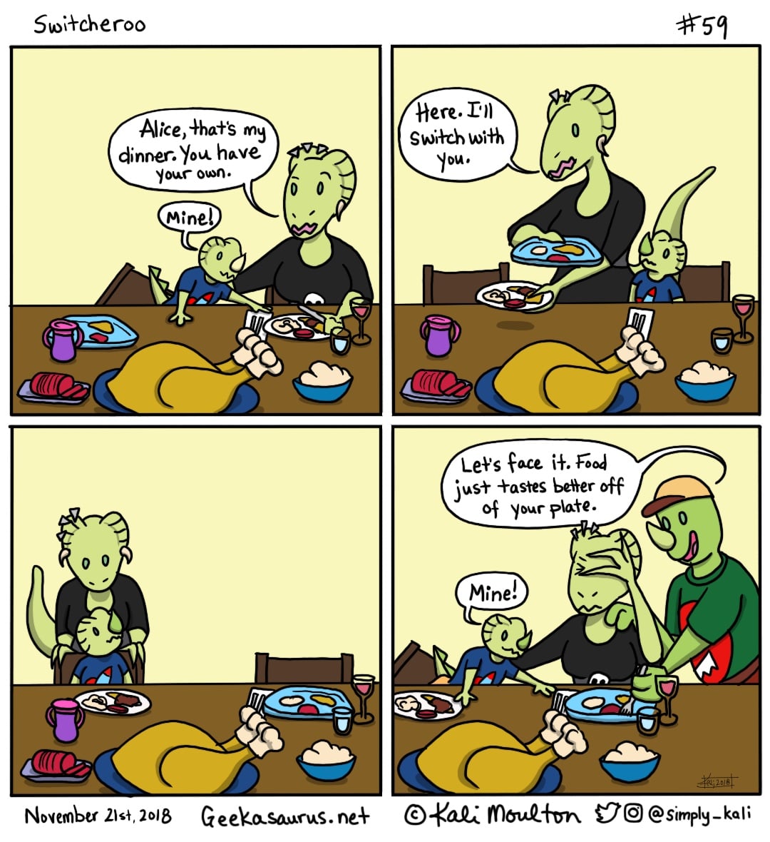 I have to eat dinner by myself in my bedroom if I want to eat. It doesn’t matter if the Dinosaur gets ahold of my dinner, my husband’s, or my father-in-law’s; she will cram it into her toothy mouth and leave you with mushed up clawed at bits of meat and vegetables that are probably covered in snot, fuzz, and drool from earlier on in the day.