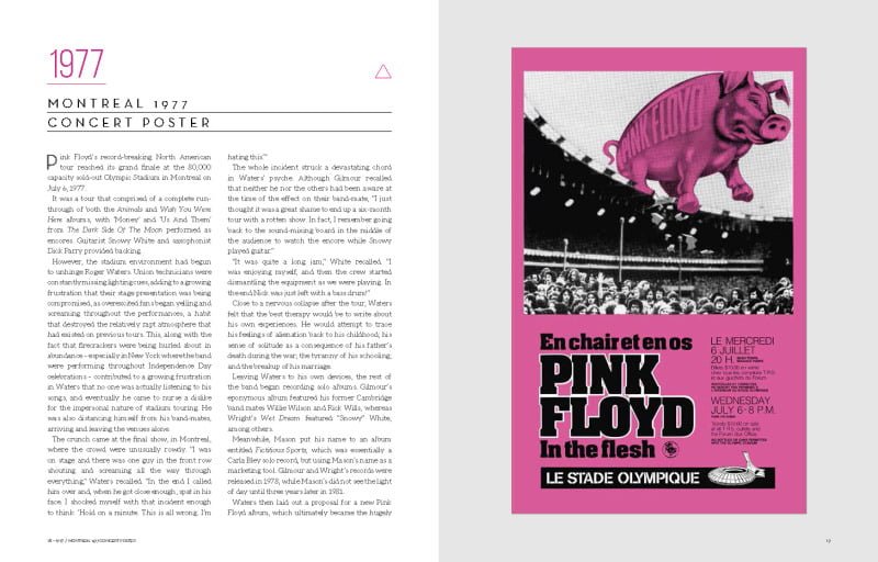 Each of the 100 objects in the book receives a full two-page spread with plenty of full-color photos and a detailed description of the object’s history and significance to the story of Pink Floyd. Early objects include a ticket to a performance by Syd Barrat’s pre-Floyd band, Those Without, photos taken at a private party when a fledgling Pink Floyd played one of their first shows, and a 7-inch acetate demo of three early songs. As the book progresses chronologically through the years, we get to see a huge variety of objects from instruments to posters, scripts to fan club newsletters, vinyl records to a Ferrari. There are small items like flyers handed out on the street, and entries for huge items that barely qualify as “objects” such as the real Battersea Power Station, complete with flying pig. Some of the more recent entries include a memorial plaque affixed at the university where the band met, the Victoria & Albert Museum where the Their Mortal Remains exhibition began, and a 2018 Nick Mason setlist.