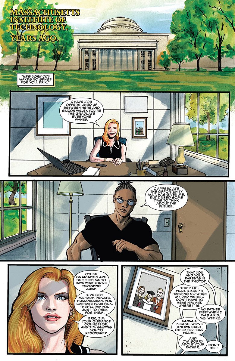 The scene flips and we see Erik graduating from MIT. The best stories start with a choice and Killmonger #1 is no different. Erik’s guidance counselor sits before him, telling him that he can have his pick of jobs. He has the opportunity to enjoy a successful and peaceful life. But Erik is not willing to or can’t step away from his desire for revenge. During the discussion Erik flashes back to how he got to where he is today.