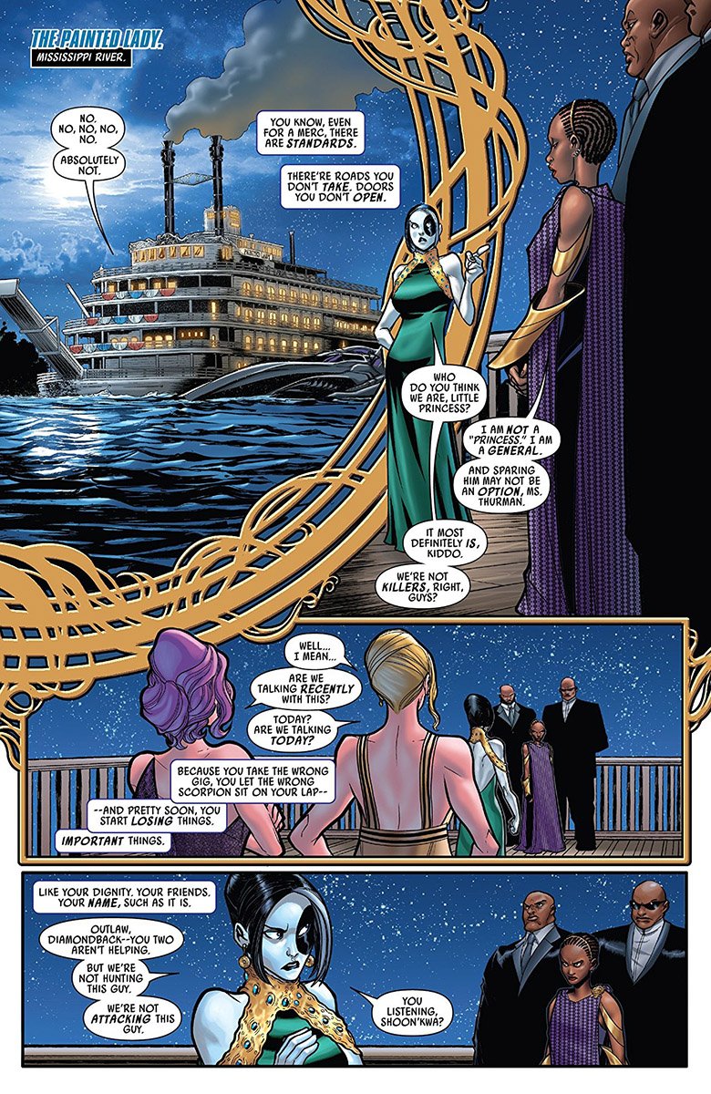 In Domino #9, Domino, Diamondback, & Outlaw are finally back aboard their riverboat The Painted Lady, having just wrapped up a job they’d accepted from Shoon’kwa, a Wakandan expatriate. Actually, it might be more accurate so say they were nearly killed stopping a Vampire Apocalypse because their employers failed to mention a tiny detail… the Vampires. Shoon’kwa reacted the way most employers would when the mercenaries they hired to simply retrieve a box complete the job by stopping a Global Vampire Resurgence. She offered them another job.