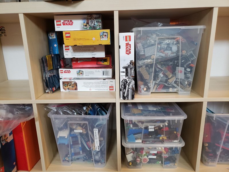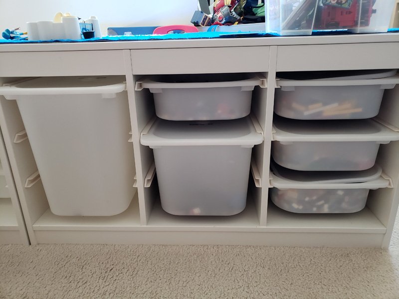 TROFAST units have three sizes of drawers you can put your LEGO in. The bigger ones might be better for projects in progress or the giant boards. The smaller ones are best for smaller pieces. You can organize your LEGO to whatever degree you want. If you want them sorted by size, go for it. If you don’t care about organizing by size and are just happy to have them off the floor, do what works the best for you. If you want different drawers for different types of LEGO like Star Wars in one drawer, that works too.