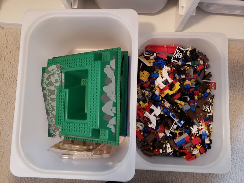 The second part of our LEGO collection is the older LEGO from my husband’s childhood. We have no idea how many completed sets there are or are not at this point, and no one wants to try to find out any more, so these are the ones our kids do more free building with. We use an IKEA TROFAST unit to store them all in. Actually, we have four of these units pushed together with a giant felt cover to make a huge play table. The only reason it’s not covered in LEGO boards is that the table is used for other non-LEGO activities as well.