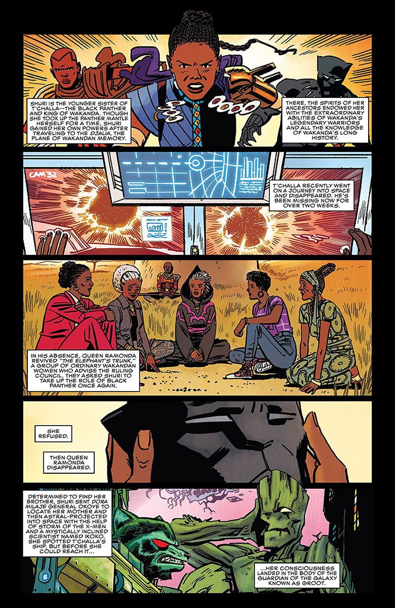 Shuri #3 opens up with Shuri and Groot sharing a body. Groot’s signature phrase has been modified to “I am Shuri.” and Rocket seems just a little too comfortable with Groot’s possession by the Princess of Wakanda. It’s not that I expected Rocket to lose his mind or anything, but he takes the news without showing the slightest interest in getting the two separated.